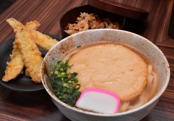 お薦めは「博多うどんかしわ飯セット」(千円)。直径10センチ超のさつま揚げ「丸天」、歯応えと香りが楽しめるごぼう天、甘めの九州しょうゆを使ったかしわ飯が付く。地元では定番の組み合わせなんだとか。