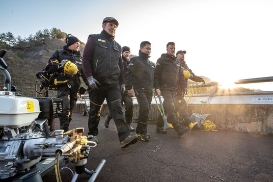 完成した縁取りに沿って、洗浄チームが高圧洗浄機でダムの壁面を洗浄します。汚れを除去した箇所とのコントラストによって、「侍」が描かれます。一度除去するともとには戻せず、失敗が許されないため、細心の注意を払い、ディテールが正確に表現されるように、長年の実績と経験をもとに洗浄作業を行います。