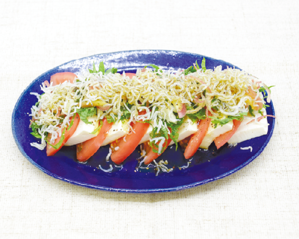 ③ ①と②を交互に並べて器に盛り付け、大葉・みょうが・ちりめんじゃこを上にのせ、よく混ぜ合わせた【A】を上からかける。仕上げに黒こしょうを振る。