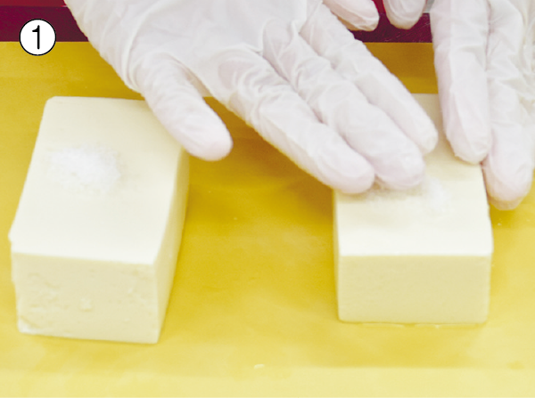 • 豆腐に塩を浸透させて水切りをすると、豆腐特有の青臭さが抜けて旨昧が凝縮し、まるでフレッシュチーズのような食感になります。