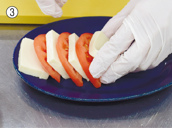 ② トマトは縦半分に切り、切った面を下にして7mm幅に切る。