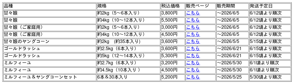 【画像:https://kyodonewsprwire.jp/img/202604237977-O4-k3LB3SAF】 【山梨県市川三郷町産】甘々娘 約2kg(5~6本入り)6月12日頃より発送予定【収穫当日発送】 https://www.ja-town.com/shop/g/g3701-2128/