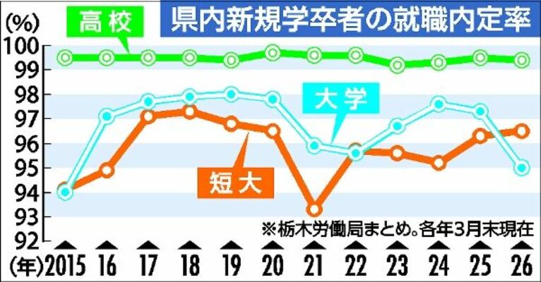 栃木労働局は28日、今春卒業した県内高校生の3月末時点の就職内定状況を発表した。内定率は99・4%で前年同月を0・1ポイント下回ったが、高水準が続いている。求職者数が減る一方で求人数は増えたことで、求人倍率は0・21ポイント増の3・27倍となり、比較可能な1998年以降で最高を更新した。同労働局は、企業の人手不足を背景に高卒人材の需要が高まっているとみている。