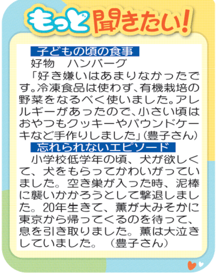 豊子さん 私は感情豊かで素直な思いやりのある子に育ってほしいと思っていました。厳しくしつけ、礼儀作法にはうるさかったので、薫は面倒な母親だと思ったかもしれません。