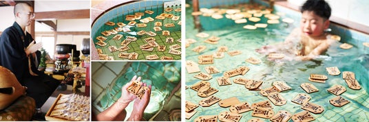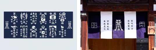 日光温泉地、12の御ゆ印札のデザインを手捺染で1枚ずつ丁寧に染めた、日光風呂詣限定の手ぬぐい。