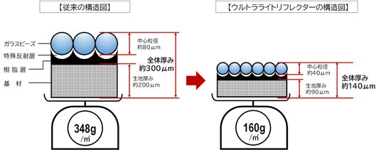 2022年9月に発売した「Ref Lite ウルトラライトリフレクター」は、半導体向けの精緻な製造技術を有する当社と、超軽量糸の製造技術を誇るカジレーネ株式会社(本社:石川県かほく市 代表取締役社長 梶 政隆)の技術を合わせて共同開発した、極薄軽量クロスです。従来のものと比較して体積比25%で製造が難しいとされていた40μmのガラスビースと、極細で超軽量糸を採用したことで、0.09mmの極薄かつ最軽量のリフレクターが誕生しました。