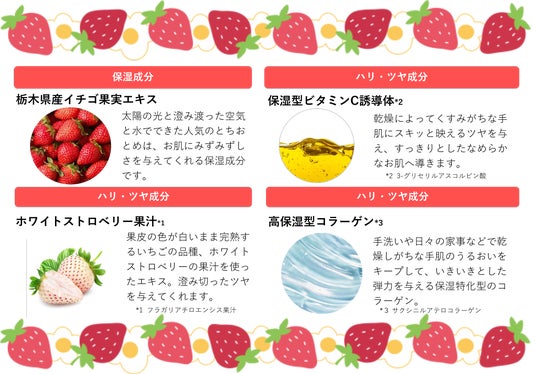 今回は栃木の農家さんによって手間暇かけて大切に育てられたとちおとめを、贅沢にハンドクリームに。とちおとめの鮮やかな赤と白くかわいいいちごのお花をあしらったパッケージで登場です。