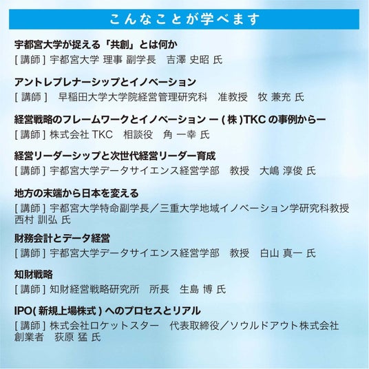 宇都宮大学(学長:池田宰)は、不透明で不確実な社会の中、新たな価値の創造に必要な経営的視点、戦略的思考、マネジメント能力とネットワークを獲得し、変化の加速度を高めていく、次世代の経営人材・社内リーダー育成プログラムを開催します。本事業はNPO法人とちぎユースサポーターズネットワーク(代表理事:岩井俊宗)が運営補助を担います。