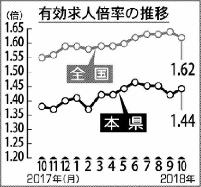 県内有効求人1・44倍 <br />10月 雇用「改善」16カ月連続