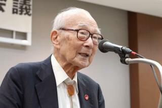 被団協の全国都道府県代表者会議であいさつする田中熙巳代表委員=8日午後、東京都内