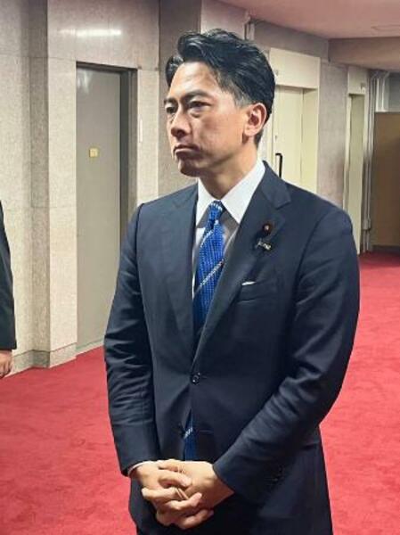 記者団の取材に応じる小泉農相=1日午前、農水省