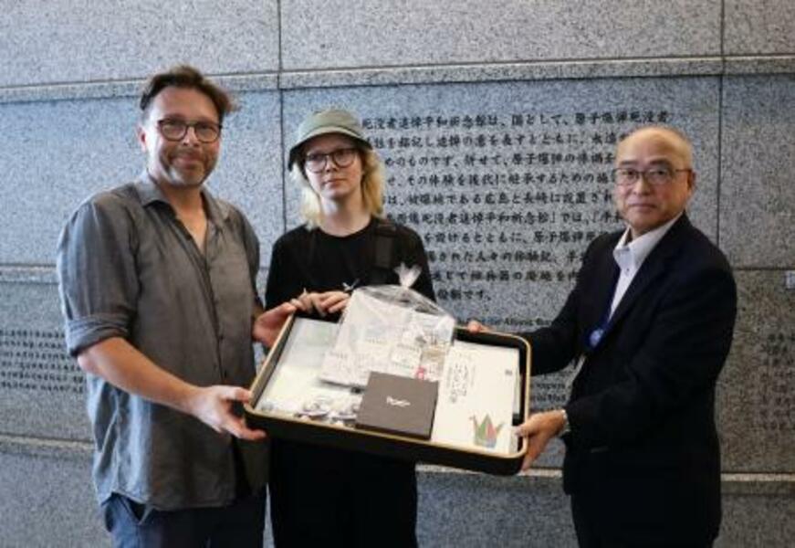 国立広島原爆死没者追悼平和祈念館の600万人目の入館者となり、漆原正浩館長(右)から記念品を受け取るプルゼメク・パンコフスキさん(左)と息子のエレンさん=1日午後、広島市中区