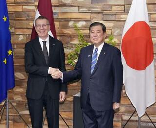 石破首相と握手するラトビアのリンケービッチ大統領(左)5月19日、首相官邸