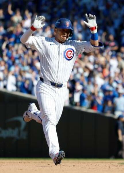 パドレス戦の5回、ソロ本塁打を放ち塁を回るカブス・鈴木=シカゴ(共同)