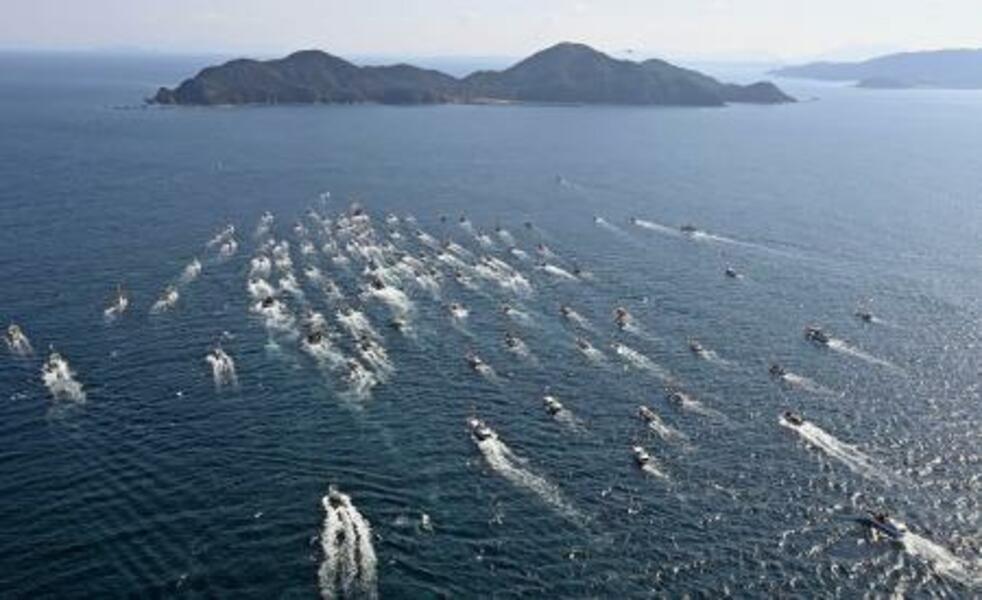 豊漁を祈る宗像大社の神事「みあれ祭」で、玄界灘をパレードする漁船団=1日午前、福岡県宗像市沖(共同通信社ヘリから)