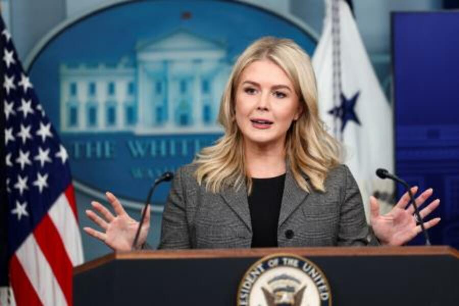 ホワイトハウスで記者会見するキャロライン・レビット米大統領報道官=1日、ワシントン(ロイター=共同)