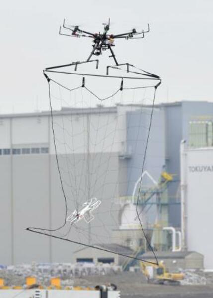 2016年1月、テロ対処訓練で小型のドローンを捕獲する警視庁の「迎撃ドローン」(上)=東京都江東区