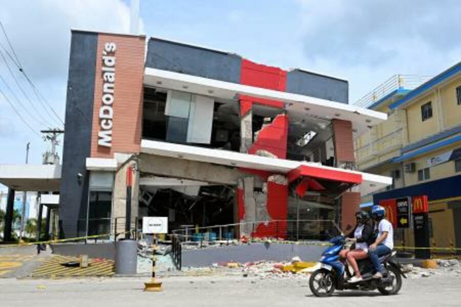 2日、フィリピン中部セブ島ボゴで、地震で損壊した店舗(共同)