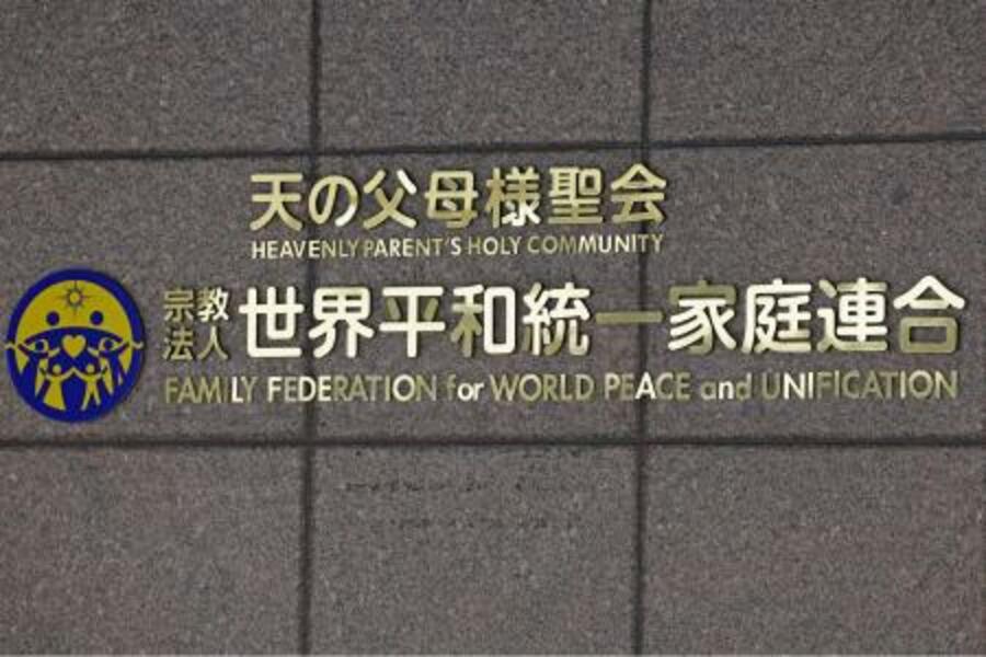 世界平和統一家庭連合(旧統一教会)の本部が入るビルに掲げられた教団の名称=2024年3月、東京都渋谷区