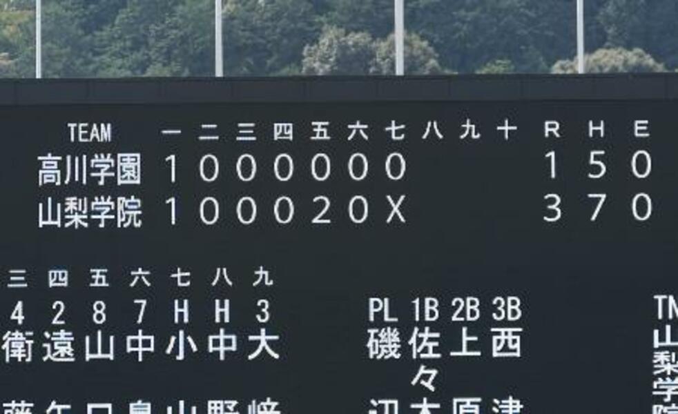7イニング制に短縮された国民スポーツ大会高校野球硬式で、決勝の山梨学院―高川学園の試合結果を示すスコアボード=2日、大津市のマイネットスタジアム皇子山
