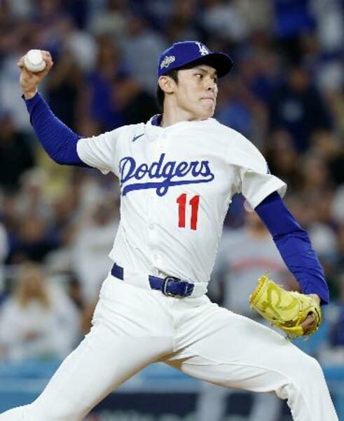 レッズ戦の9回、登板したドジャース・佐々木=ロサンゼルス(共同)