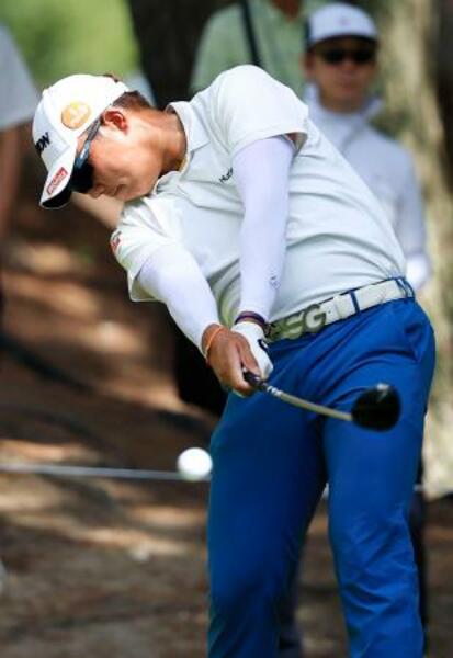 第1日、11番でティーショットを放つ小斉平優和。5アンダーで首位=三好CC