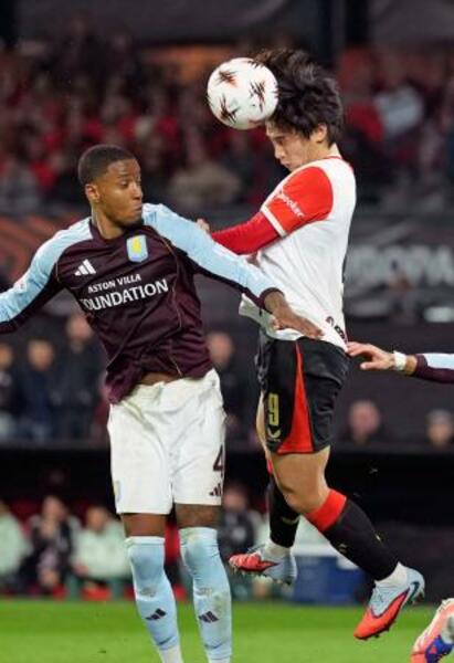 アストンビラ戦でヘディングするフェイエノールトの上田(右)=ロッテルダム(共同)