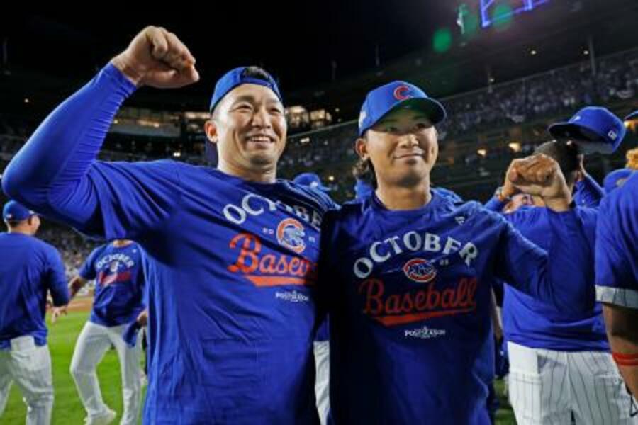 パドレスに勝利し地区シリーズ進出を決め、今永(右)とポーズをとるカブス・鈴木=シカゴ(共同)