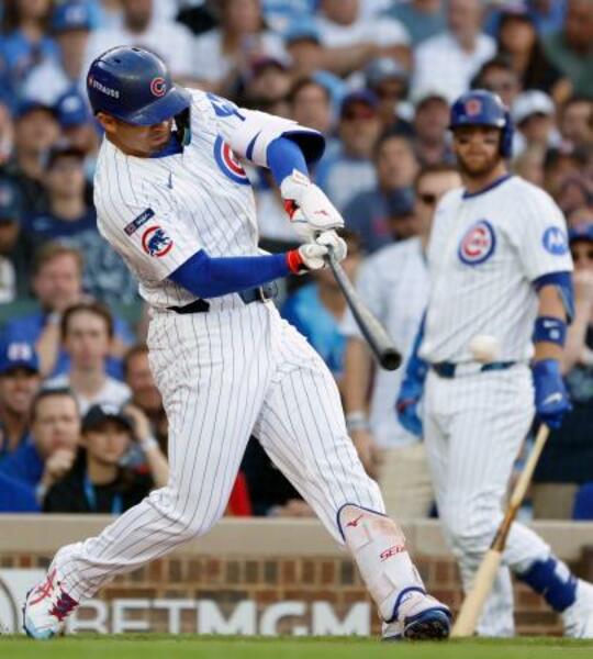 パドレス戦の2回、二塁打を放つカブス・鈴木=シカゴ(共同)