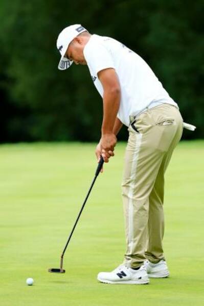 第2日、1番でパットを放つ小斉平優和。通算8アンダーで首位=三好CC