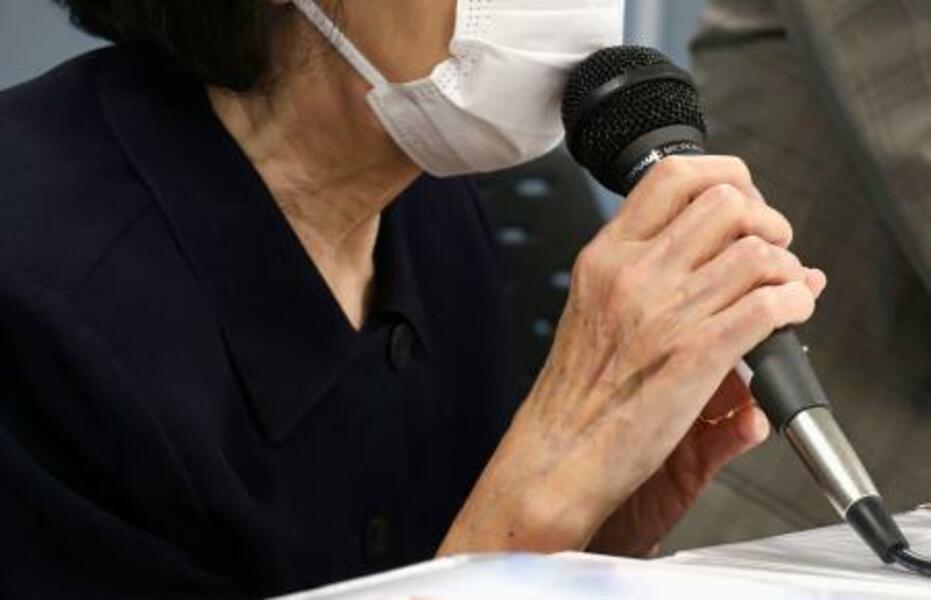 判決後に記者会見する、自殺した男性の母親=3日午後、長崎県庁