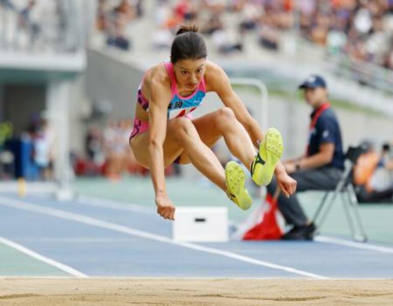 成年女子三段跳び 13メートル64の大会記録で優勝した福岡・高島真織子=平和堂HATOスタジアムム