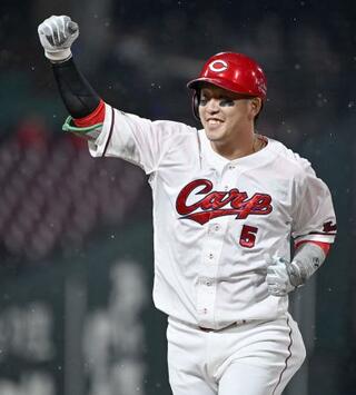 1回、安打を放ちガッツポーズの広島・小園=マツダ