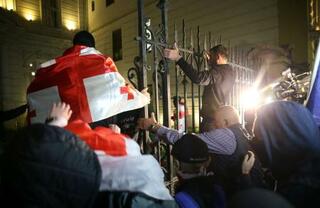 ジョージア首都の大統領宮殿への侵入を試みるデモ参加者=4日、トビリシ(ロイター=共同)