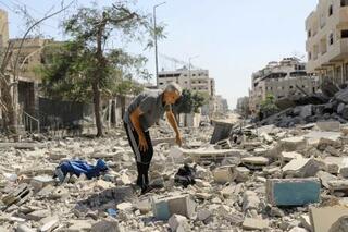 ガザ北部ガザ市で、被害の状況を見るパレスチナ人男性=4日(ロイター=共同)