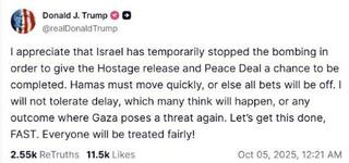 トランプ米大統領が4日、SNSに投稿したメッセージ。イスラエルがパレスチナ自治区ガザ攻撃を巡り一時的に爆撃を停止したとして「感謝する」と記した(SNSトゥルース・ソーシャルから)