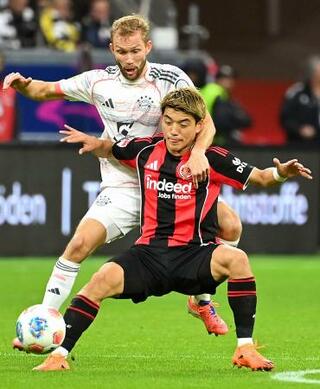 バイエルン・ミュンヘン戦で競り合うEフランクフルトの堂安(手前)=フランクフルト(共同)