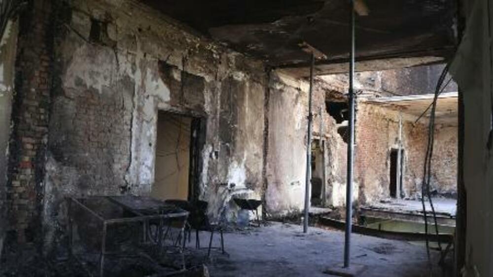 ロシアのミサイル攻撃で損傷したウクライナ政府庁舎の内部=9月、キーウ(共同)