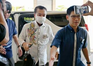 登庁する沖縄県南城市の古謝景春市長(左)=6日午前、南城市役所