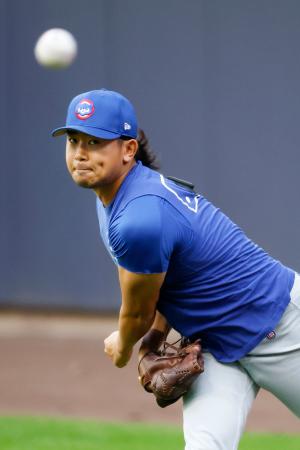 キャッチボールするカブス・今永=ミルウォーキー(共同)