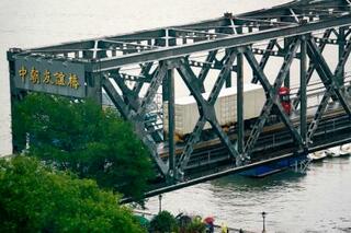 中国遼寧省丹東から北朝鮮に向かうトラック=6日(共同)
