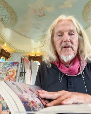 スイスのアトリエからオンラインで取材に応じる贋作家ウォルフガング・ベルトラッキ氏(共同)