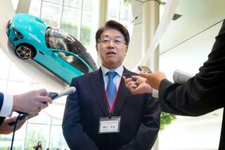 小米科技(シャオミ)のEV工場を視察後、取材に応じる東京都日中友好議員連盟協議会の東村邦浩会長=14日、北京(共同)