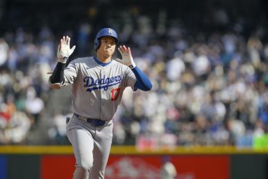マリナーズ戦で自己最多を更新する55号ソロを放ち、塁を回るドジャース・大谷=9月、シアトル