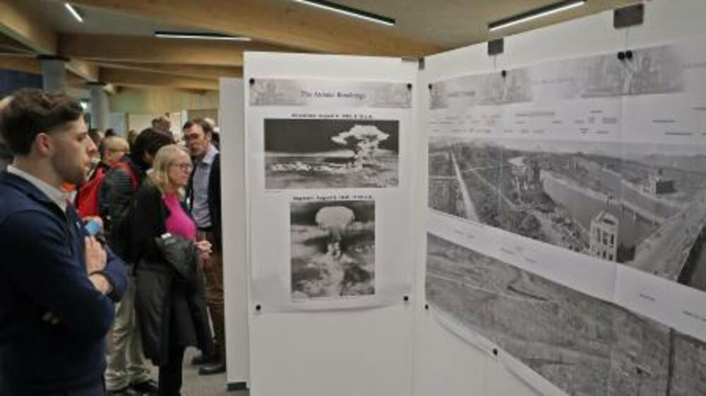 6日、英北部スコットランドのスターリング大で開かれた原爆展で、原爆被害を伝える写真を見る人々(共同)