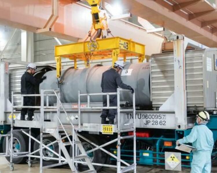 ウラン濃縮工場に搬入される原料ウラン=7日午後、青森県六ケ所村