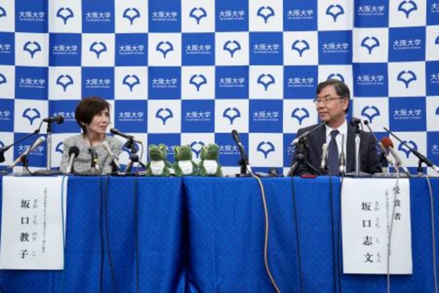 ノーベル生理学・医学賞に選ばれ、記者会見する大阪大の坂口志文特任教授(右)と妻で研究者の教子さん=7日午後、大阪府吹田市