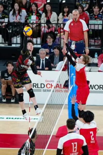 サントリー―ペルージャ 第4セット、スパイクを決めるペルージャの石川(左)。右奥はサントリーの高橋藍=有明アリーナ(代表撮影)