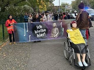 ベルリンの公有地にある少女像の存続を求めてデモ行進する参加者=7日(共同)