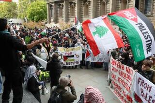 パレスチナへの連帯を示すデモに参加した学生たち=7日、ロンドン(共同)